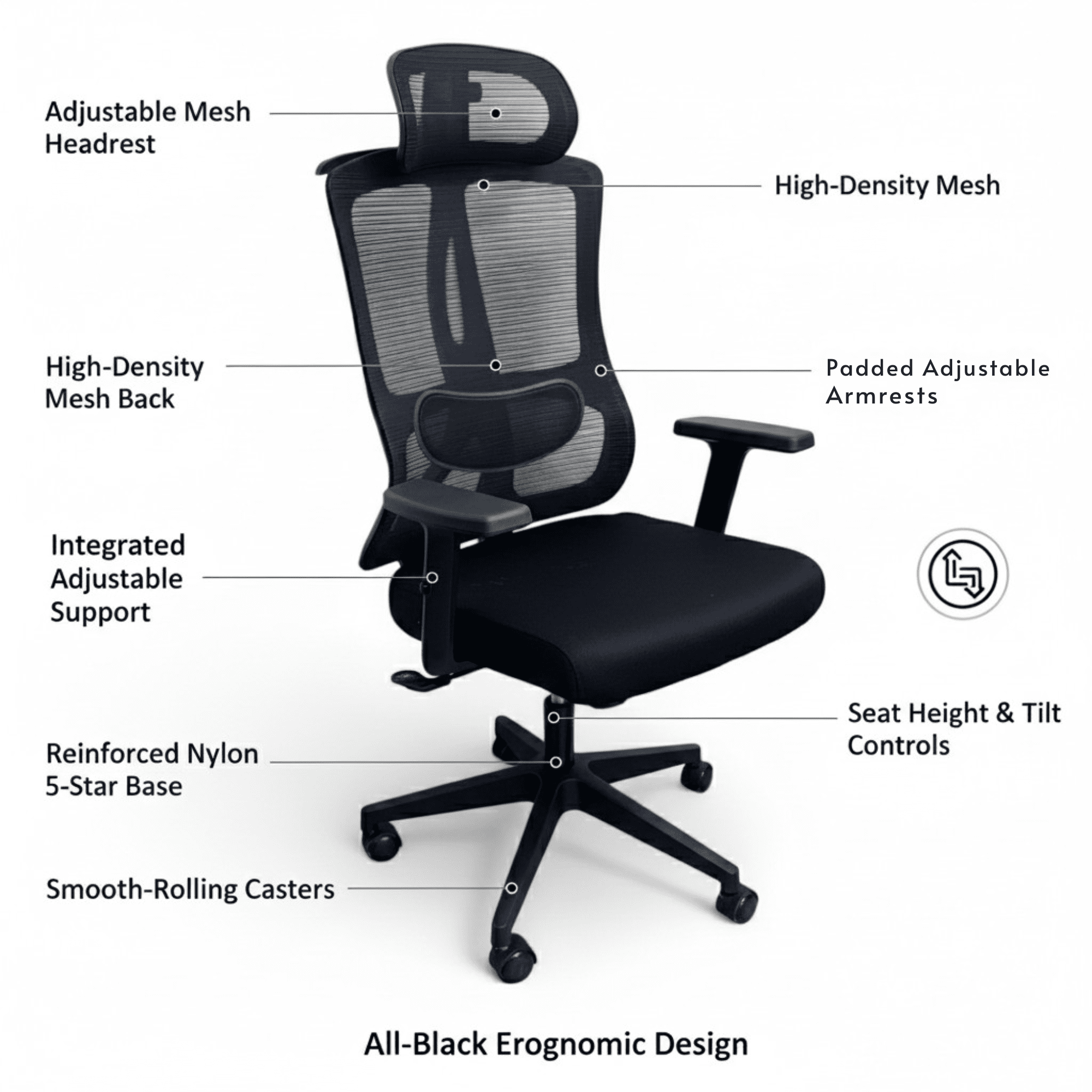 Ergonomic Mesh Office Chair – With Adjustable Height & Headrest, Lumbar Support, W-Shaped Cushioned Seat, Recline Lock