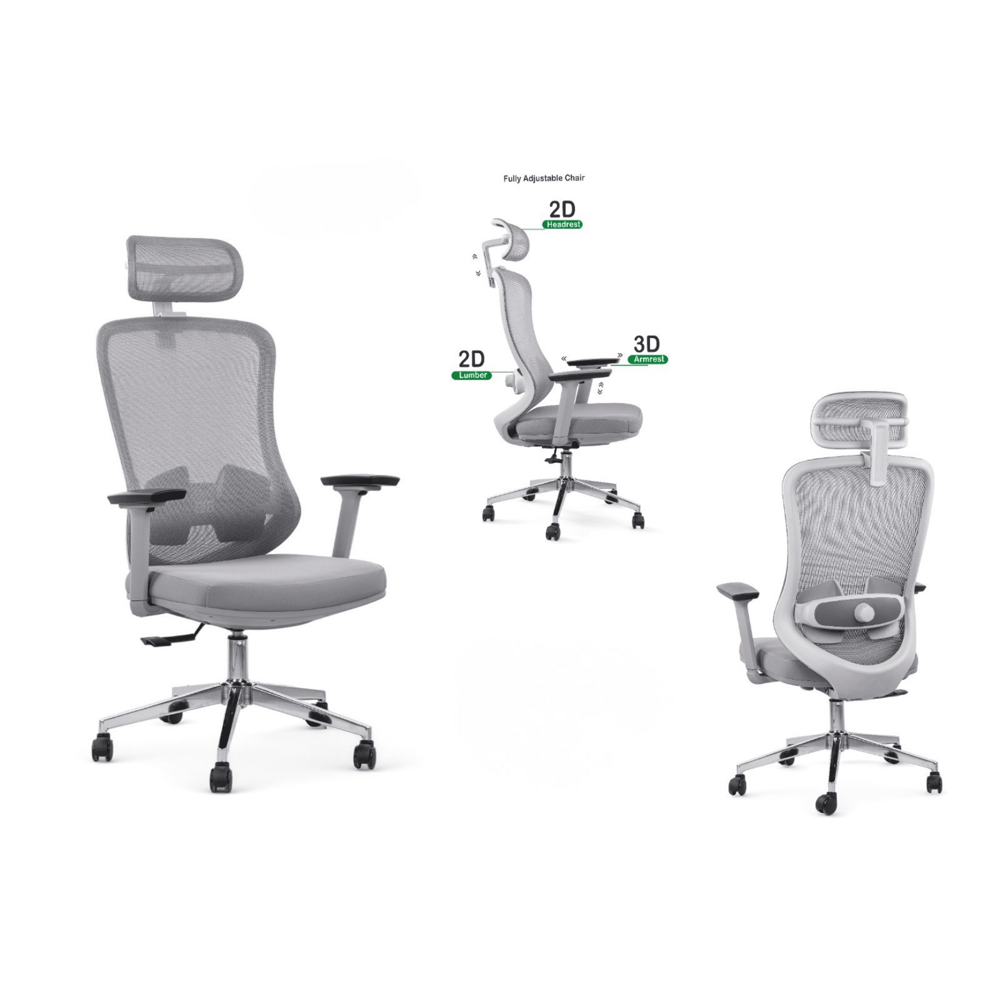 Ergonomic Mesh Office Chair with 2D Lumbar & 3D Armrests – Grey