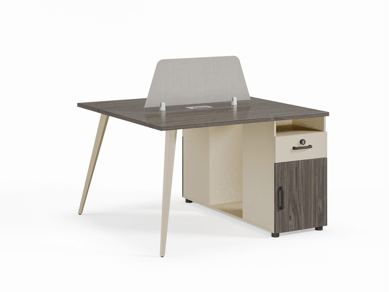 Elevate your workspace with this Modern 2-Person Office Desk Workstation. Featuring a sleek two-tone design with a durable wood-grain laminate desktop and sturdy white metal legs, this compact shared desk is perfect for small offices or call centers. The integrated storage unit includes a lockable filing cabinet and open shelving, while the central privacy partition screen defines individual working spaces. This contemporary cubicle desk provides style, functionality, and professional organization for any commercial or home office setting.