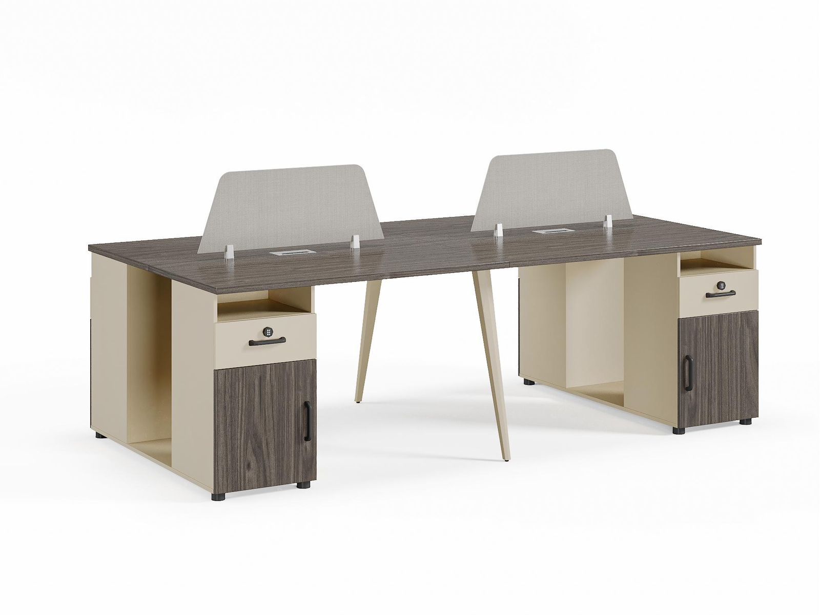 Maximize collaboration and efficiency with this expansive Four-Person Office Workstation Desk. This modern 4-seater cubicle table is designed for open-plan offices, call centers, or shared work environments. It features a stylish two-tone dark wood grain and cream finish and is built on sturdy central metal legs. Each of the four workspaces is equipped with its own integrated storage unit, including a lockable drawer and a cabinet, providing essential personal security and organization. Fabric partition screens are centrally mounted to offer a comfortable level of privacy without sacrificing interaction. This modular office desk system is the ideal choice for businesses seeking a professional and functional solution for a team of four.